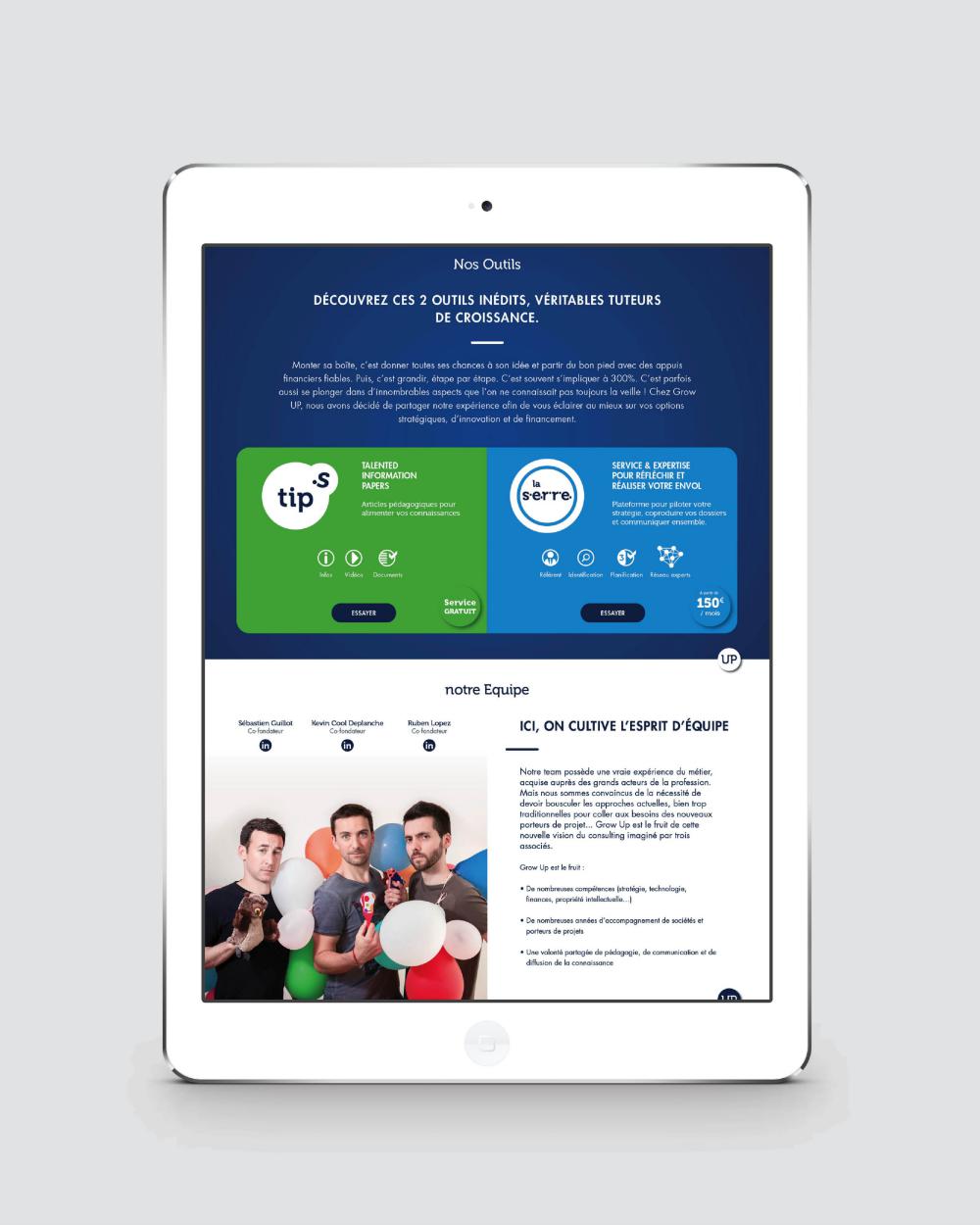3 trentenaires, issus du métier traditionnel du conseil et de l’accompagnement de projets innovants s’associent pour créer GROW UP, une société qui a pour objectif de booster la croissance de toute start-up sans se planter, en bouleversant les codes établis. Ils font appel à Dorothée Giraud (MOTOEUR), conceptrice rédactrice pour le naming et le rédactionnel. Les bases posées, un travail d’équipe se met en place. Je développe la création du logo, une mini charte et le design web du site vitrine et des 2 sites associés.